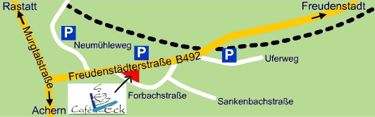Wir liegen mitten im Zentrum Baiersbronns an der B492. Parkmöglichkeiten bestehen an der Hauptstraße auf der Rückseite des Cafés, am Uferweg hinter den Gleisen und im Neumühleweg. Auf Wunsch kann für Busse ein Parkplatz reserviert werden.
